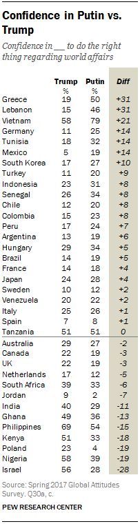 As Donald Trump’s White House spirals deeper into crisis, the rest of the world seems to be giving up on America’s new president. A survey by Pew Research Centre showed that respondents in 22 out of 36 countries trusted Russian President Vladimir Putin more than Trump when it comes to handling global affairs. And that includes American allies like Germany, France and Japan. (Donald Trump edged out Putin in the UK, India and Israel.)